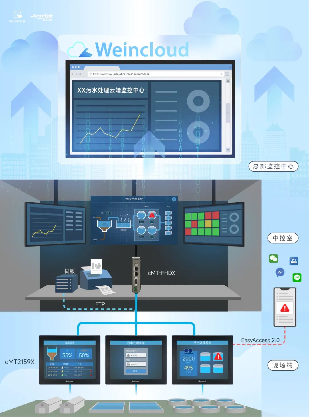 借由 EasyAccess 2.0 遠程連線服務,管理者對該系統有全面性的監控。當設備數據異常時,系統立即推送消息,通知人員現場狀況。透過穿透功能,運維人員可以直接遠程從HMI連線至PLC,校對參數并排除現場問題。